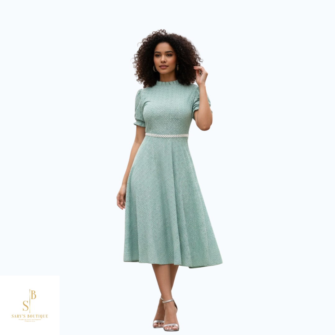 Las mangas con ligero volumen y el cuello con volantes añaden un toque romántico, mientras que el cinturón de perlas acentúa la cintura con sutileza y distinción.